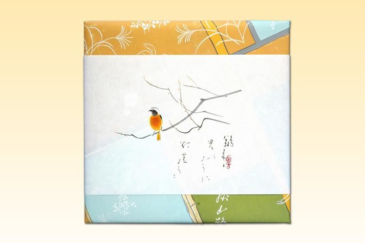 季節の俳画掛け紙で包装します。今月は「ジョウビタキ〜ひたき来る 光のように 灯のように」です。